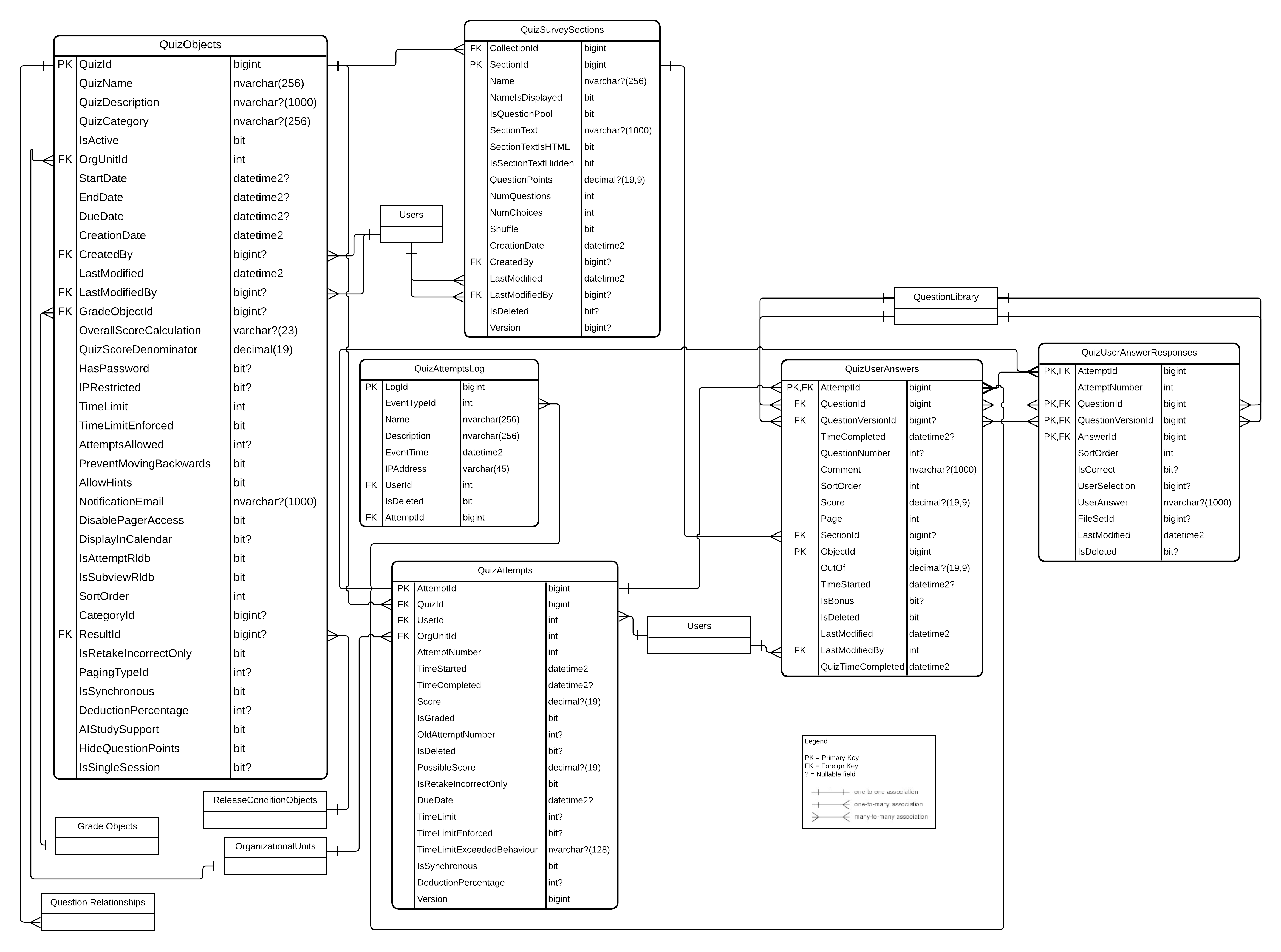 يوضح الرسم البياني الآتي العلاقات بين الكيانات المستخدمة لإنشاء مجموعات بيانات Brightspace للاختبارات. لتكبير الرسم البياني، انقر بزر الماوس الأيمن فوق الصورة وحدد فتح صورة في علامة تبويب جديدة.
