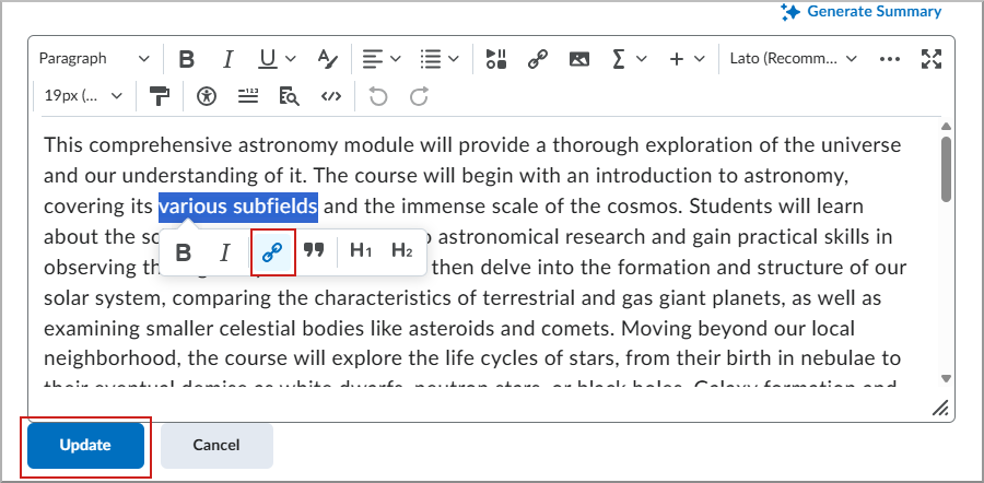 - اختر الوجهة (على سبيل المثال، إدراج ارتباط سريع للاختبارات والمناقشات) أو حدد عنوان URL للحصول على عنوان ويب.