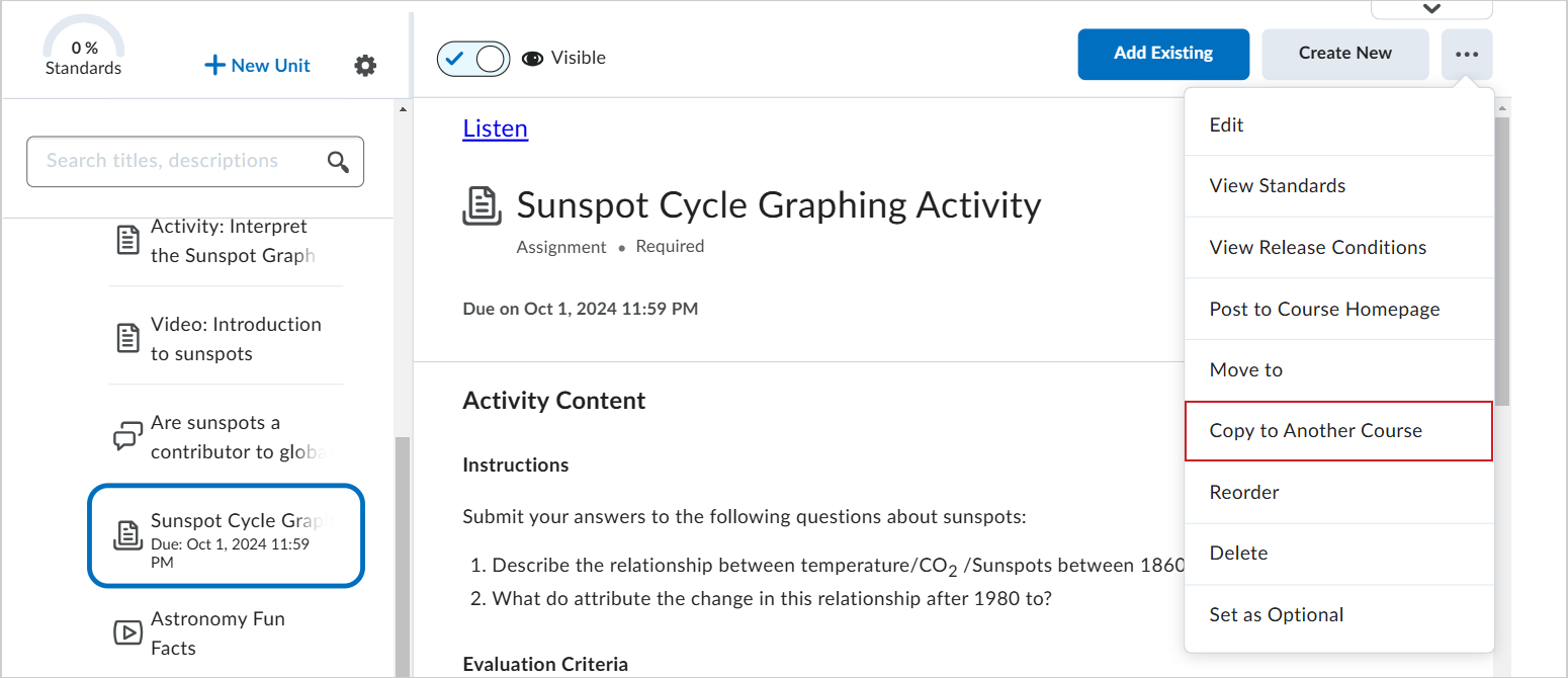 - من قائمة الواجبات في تجربة المحتوى الجديدة (الدروس)، انقر لتوسيع القائمة المنسدلة مزيد من الإجراءات. ثم انقر فوق نسخ إلى مقرر تعليمي آخر.