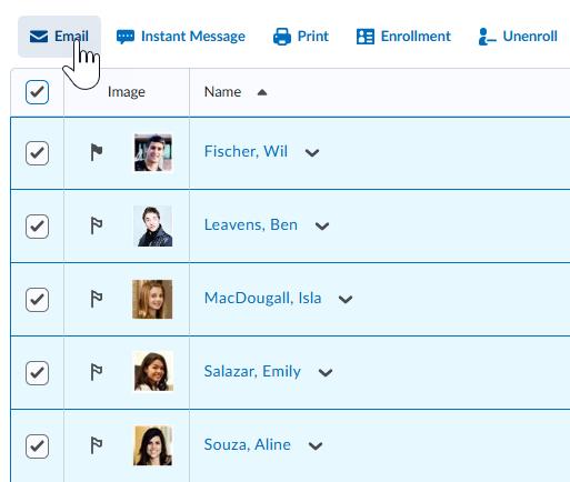 - حدد خانات الاختيار الموجودة على يمين كل طالب تريد إرسال رسالة بريد إلكتروني له، ثم انقر فوق البريد الإلكتروني.