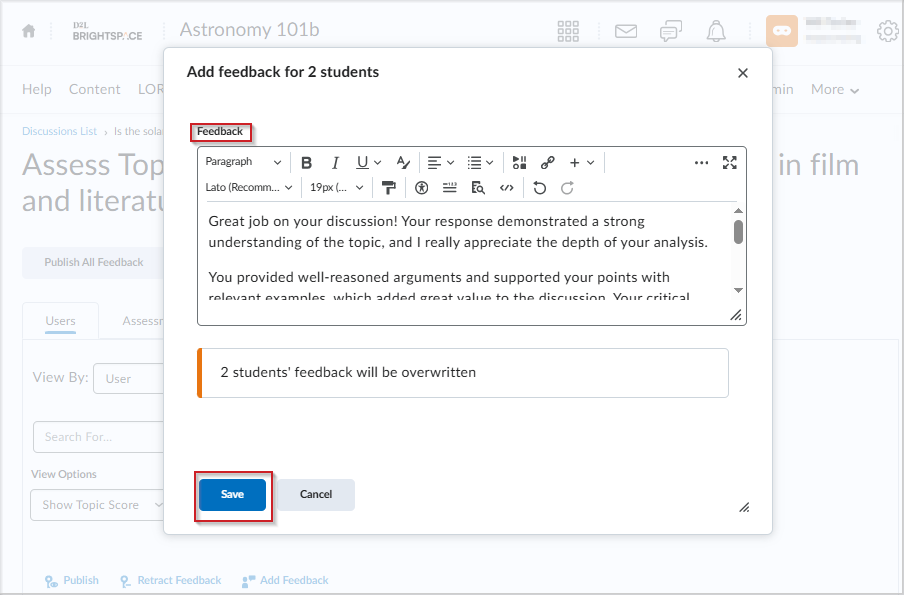 يمكنك توفير الوقت من خلال تقديم تعليقات مجمعة للعديد من المتعلّمين مباشرةً من صفحة تقييم الموضوع في المناقشات. تتيح لك هذه الميزة إضافة تعليقات إلى الطلاب المحددين أو جميع الطلاب في وقت واحد، ما يسهل عملية التقييم.