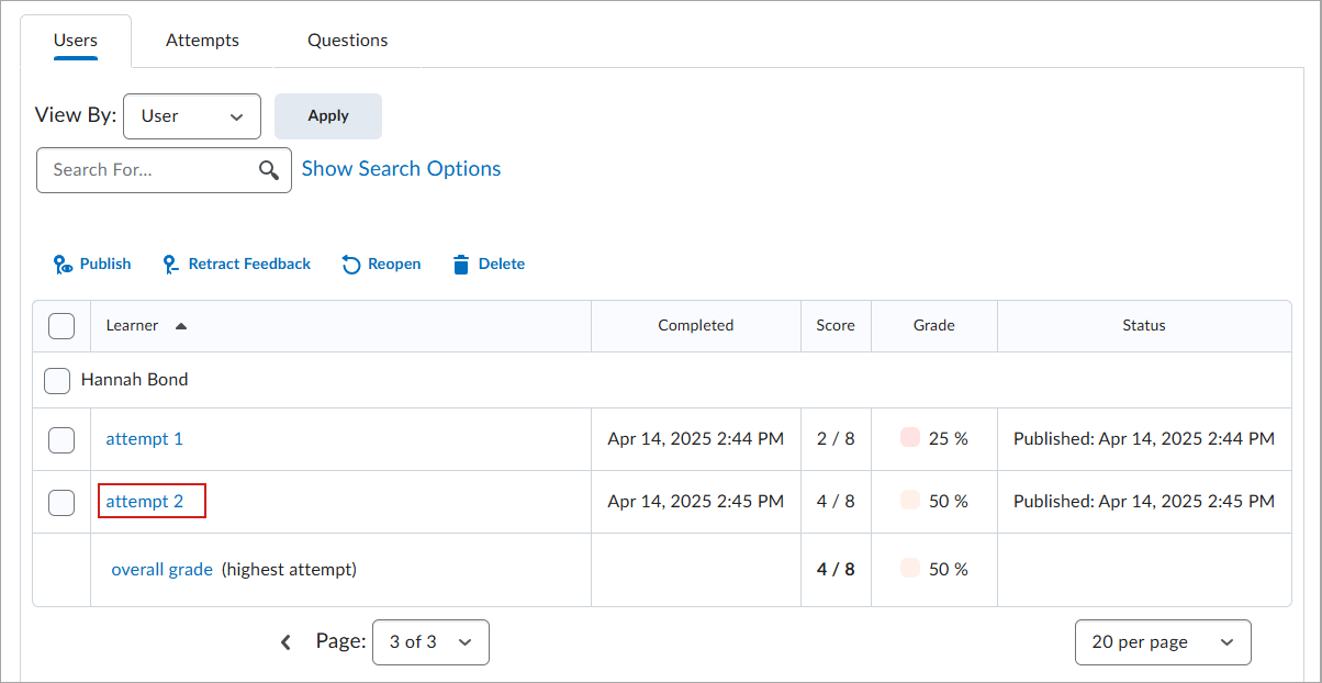 بالإضافة إلى ذلك، في علامة تبويب المستخدمون، يتم سرد محاولات إعادة الإجابة لتمييزها عن المحاولات الأولى.