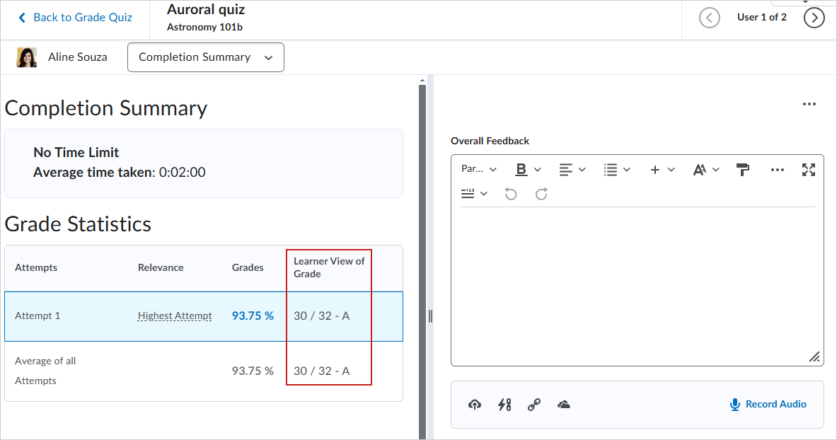 - في علامة التبويب المستخدمون، انقر فوق محاولة الطالب التي تريد تقييمها.