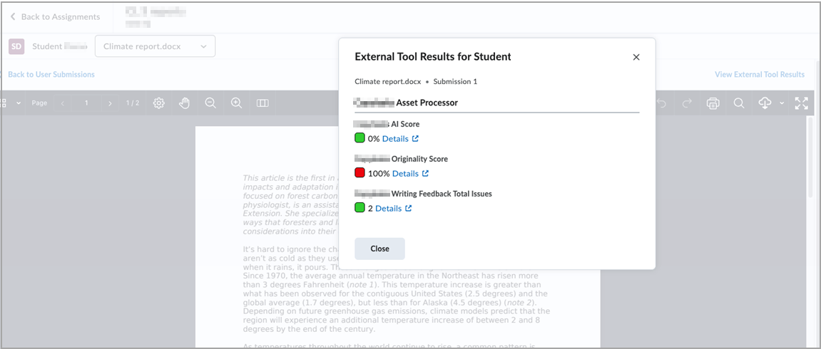 - من صفحة تفاصيل تسليم الواجبات في التقييم المتسق، انقر فوق عرض نتائج الأداة الخارجية لفتح نافذة نتائج الأداة الخارجية لـ [اسم الطالب]. انقر فوق التفاصيل لفتح التقرير المفصّل في نافذة جديدة.