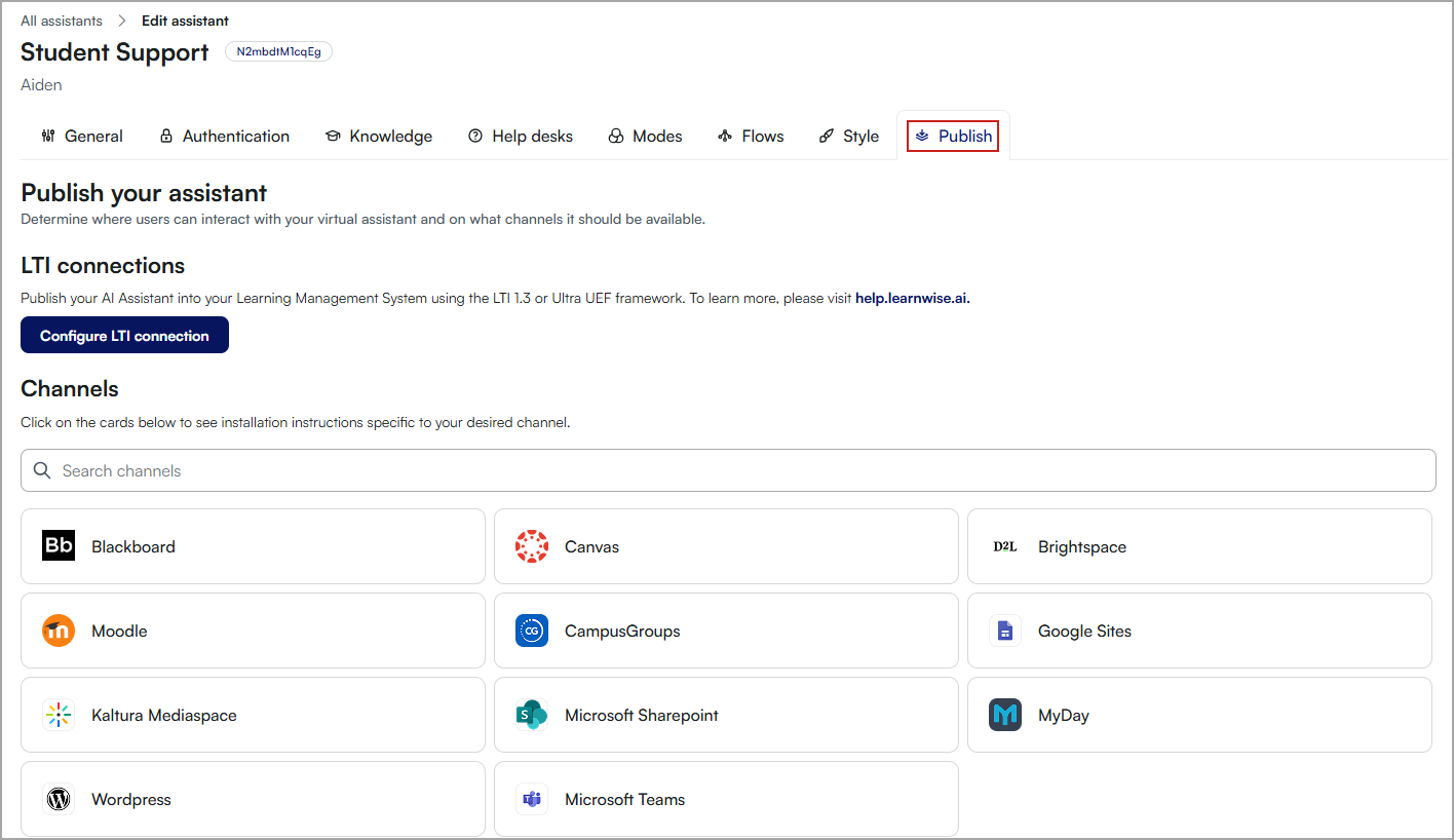 - انقر فوق علامة التبويب نشر لعرض جميع القنوات التي يمكنك نشر المساعد الخاص بك فيها.
