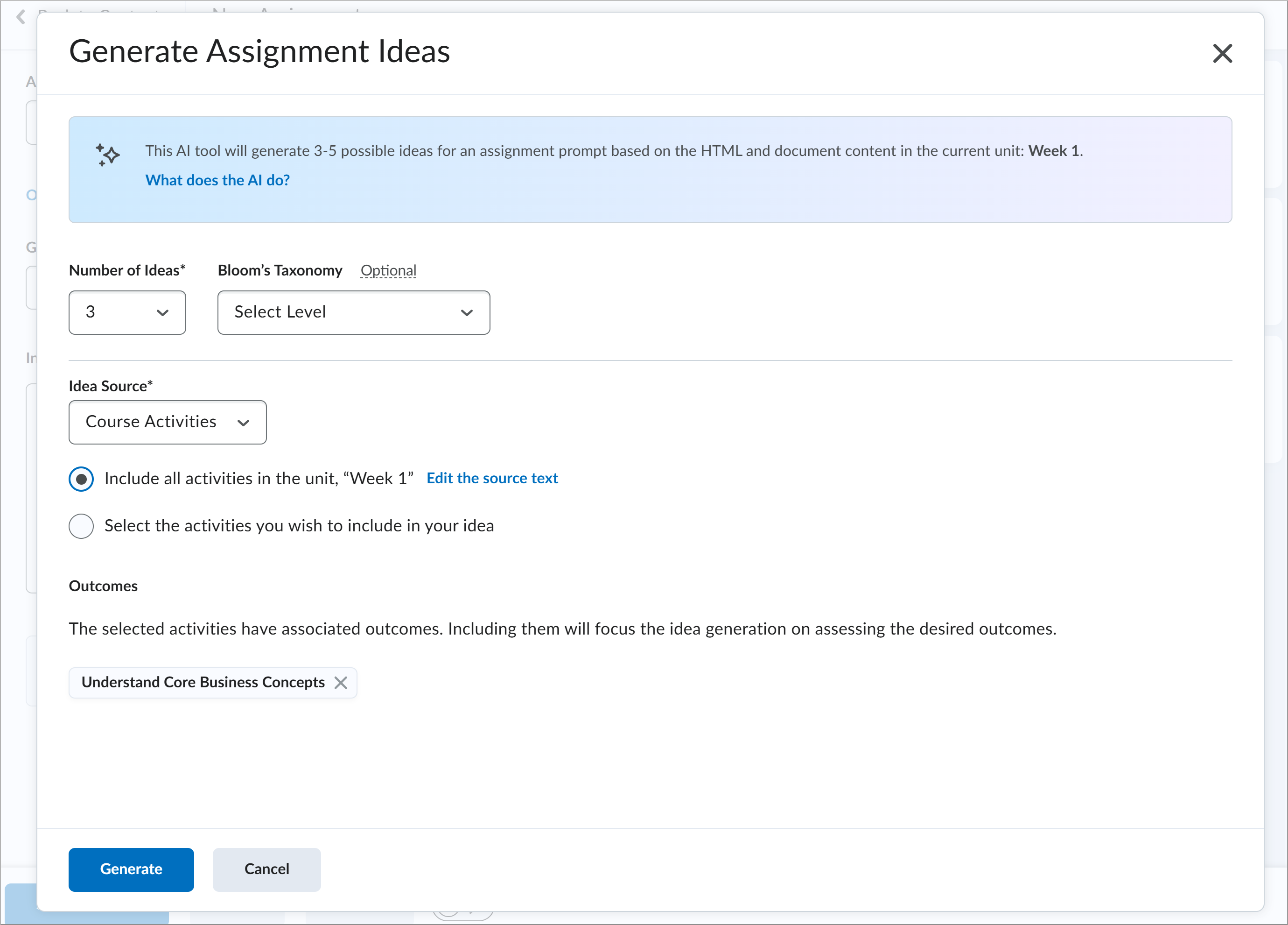 - يمكن للمستخدمين الآن تحديد ما يصل إلى خمسة أنشطة مقرر تعليمي لإنشاء الأسئلة، في حين كان من الممكن في السابق اختيار نشاط واحد فقط.