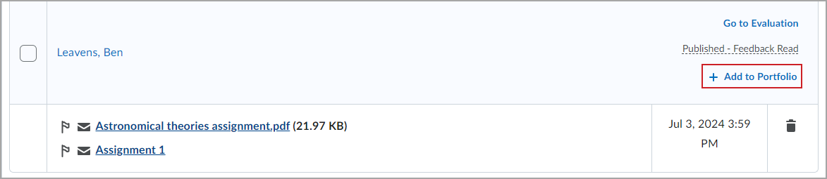 Puede agregar material enviado de asignaciones a Brightspace Portfolio. Cuando agrega material enviado de asignaciones al Portafolio, todas las versiones del material enviado, los comentarios y las calificaciones se agregan al Portafolio.