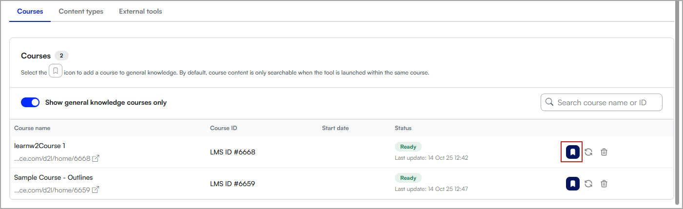La designación de un curso como conocimientos generales hace que su contenido sea accesible para todos los asistentes de IA de Brightspace, independientemente del curso específico con el que esté interactuando el usuario. Esto resulta especialmente útil cuando las instituciones utilizan los cursos como repositorios de información que debe estar disponible en toda la institución.