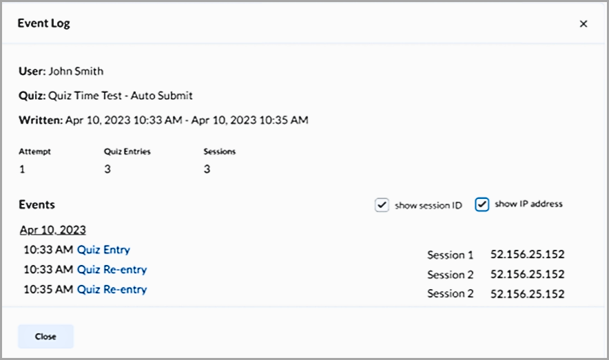 Important : Lorsque vous consultez un Journal de tentatives de réponse à un questionnaire, nous vous recommandons de faire preuve de prudence avant de conclure que la tricherie a eu lieu uniquement, car plusieurs adresses IP ou ID de session ont été consignées. Des raisons valables peuvent justifier leur utilisation. Ces renseignements sont destinés à soutenir votre enquête et doivent être évalués en tenant compte du contexte et d'autres données pertinentes.