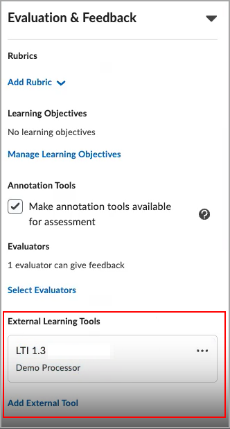 Si cette option a été configurée pour votre organisation, vous pouvez associer des outils d'apprentissage externes en tant que processeurs à des travaux, qui évalueront l'originalité, l'utilisation de l'intelligence artificielle, la grammaire, etc., dans les travaux soumis. Ces intégrations d'outils examinent automatiquement les soumissions des élèves et génèrent des rapports. Vous pouvez associer ces outils à des travaux, nouveaux ou existants. Une fois associé à un travail, l'outil externe est déclenché pour traiter les soumissions précédentes et subséquentes, puis générer des rapports. Les élèves peuvent consulter ces rapports à aux pages Consulter la rétroaction et Historique des soumissions.