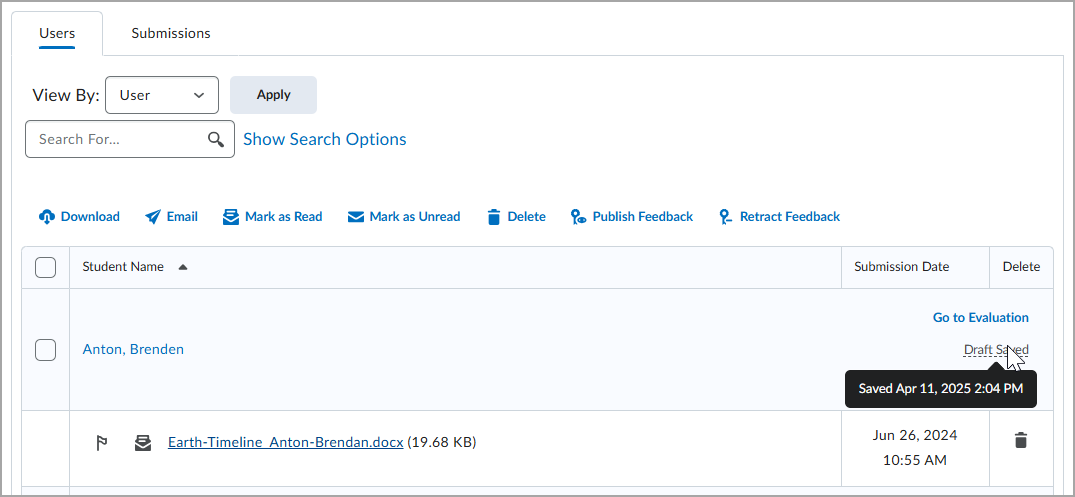 - Klik op de pagina Indieningen van die opdracht op Gebruikers.