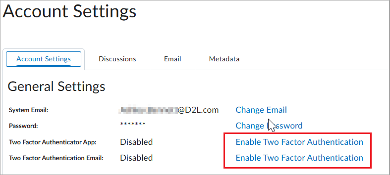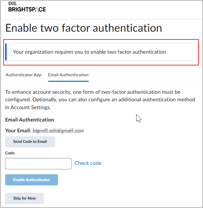 Importante: se você não tiver um e-mail externo configurado em sua conta do Brightspace, a opção para configurar a autenticação de dois fatores baseada em e-mail não será exibida.