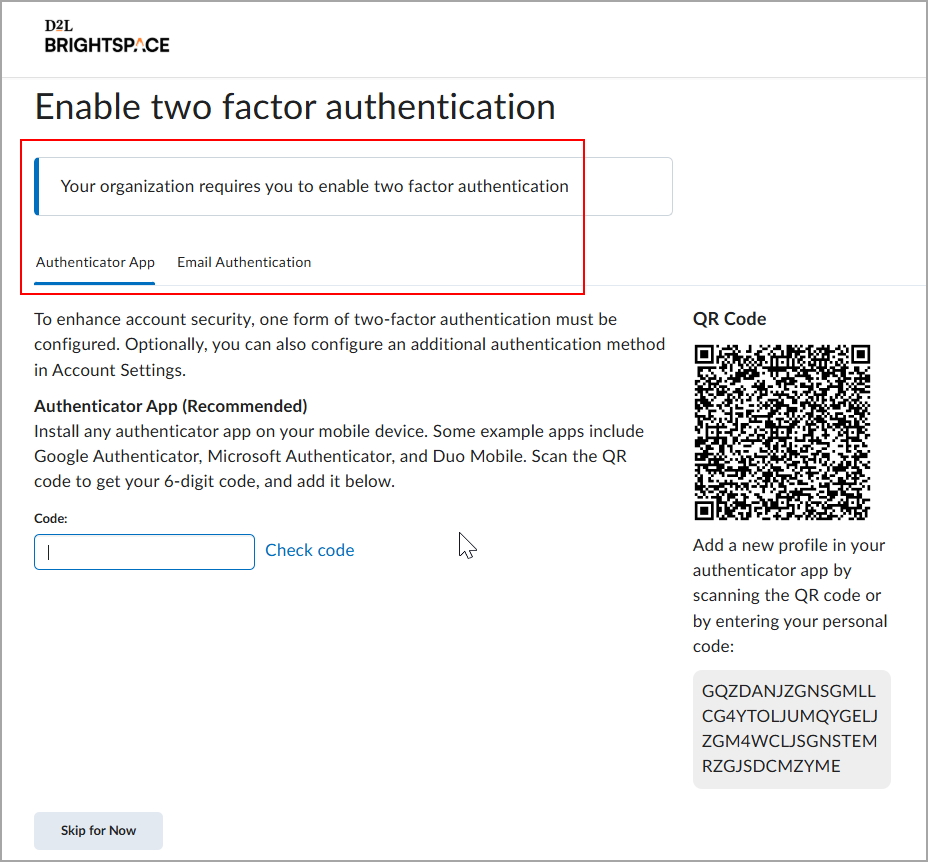 - Siga as instruções no aplicativo autenticador para salvar o código do Brightspace para referência futura. Clique em Enviar Código para E-mail e insira o código.