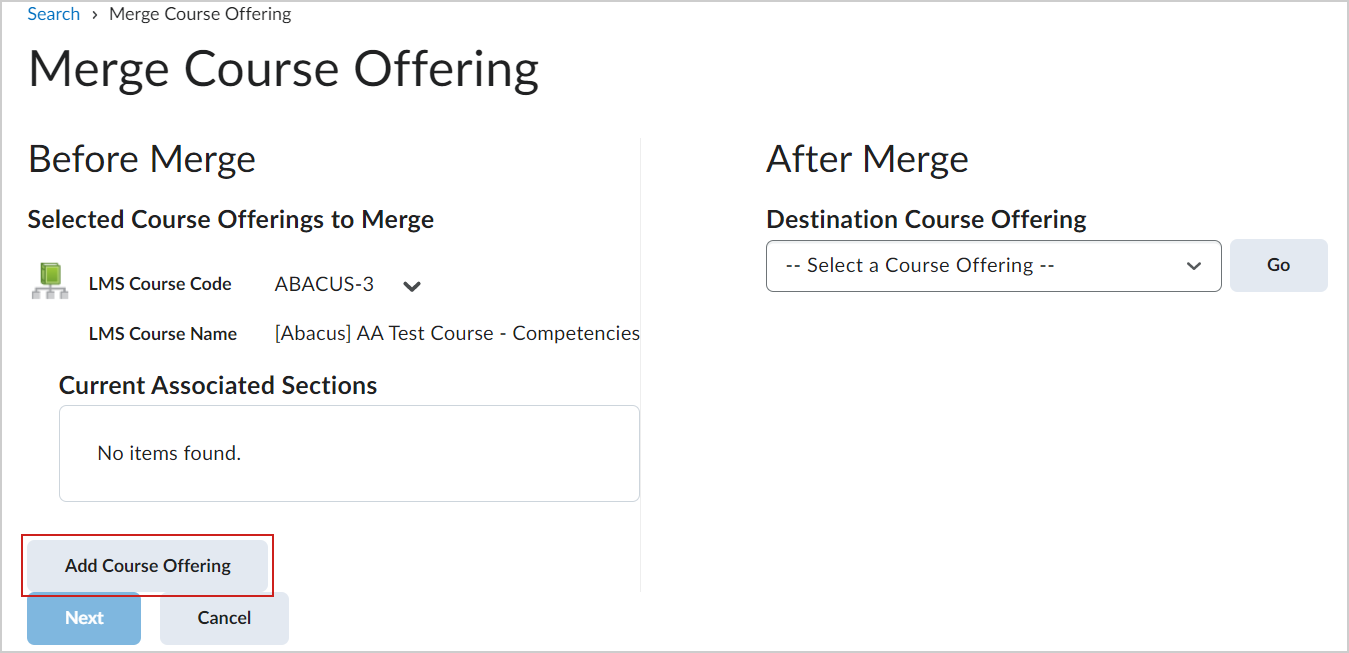 - Na página Mesclar oferta de curso, compile as ofertas de curso que deseja mesclar clicando em Adicionar oferta de curso.