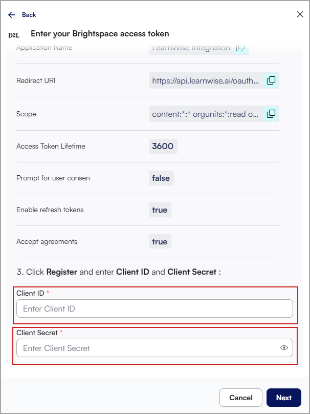 - Insira o ID do Cliente e o Segredo do Cliente do Brightspace.