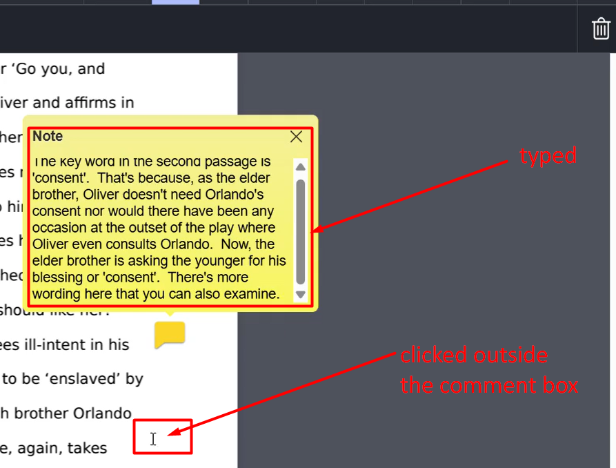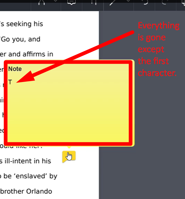 I have, however, learned a few things about this. First, it is far more common when the note is typed quickly. I surmise that what is happening is that the server is not uploading the text constantly - though I never had this problem in Blackboard or in MS Word. Second, I have improved results when, after typing the comment, I hit the enter key a couple of times and then backspace a couple of times to remove it. This has reduced the frequency of the problem. Still, it isn't perfect. Typically, I am losing roughly 1-2 notes out of 10. Third, sometimes, if you hit the return arrow key you can restore the note. But this doesn't work all the time.