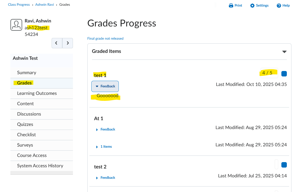 All the graded items would normally appear under class progress along with the feedbacks provided.