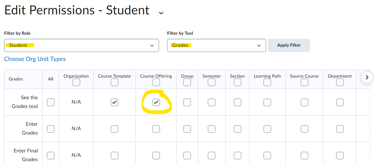 If Students cannot see their own Grades in their course then either the Grades link is not present on the navbar or they don't have permission to do so. Presuming it's the latter, go to Admin Tools > Roles & Permissions, choose the Grades tool for the Student role, and check the "See the Grades tool" permission at the Course Offering level.