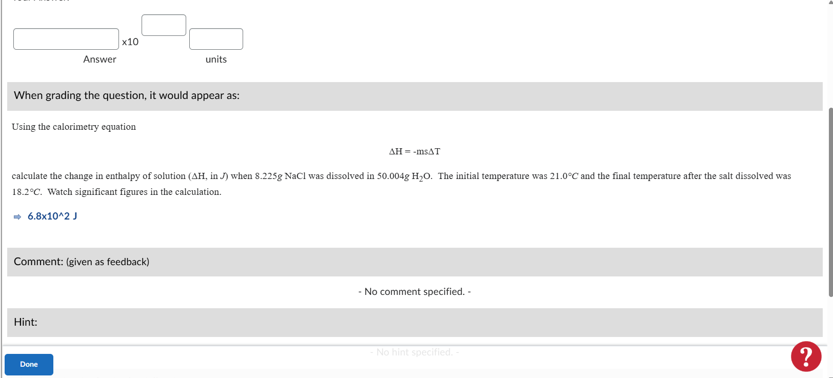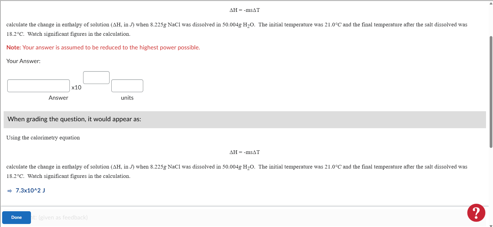In quizzes, has anyone else experienced an issue where the correct answer changes in certain mathematical/significant figures questions? There seems to be no rhyme or reason and in the auto grading function, some students' responses will be marked correct and others will be marked incorrect even though all had the same response (6.8x10^2 J in the case of the below example).