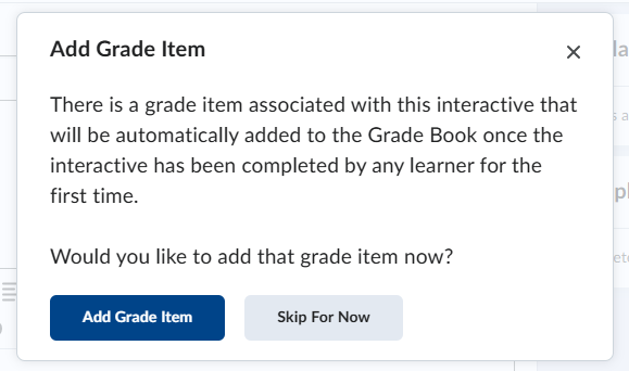 Screenshot showing in Brightspace to confirm whether or not a grade item should be created for an H5P that has just been created