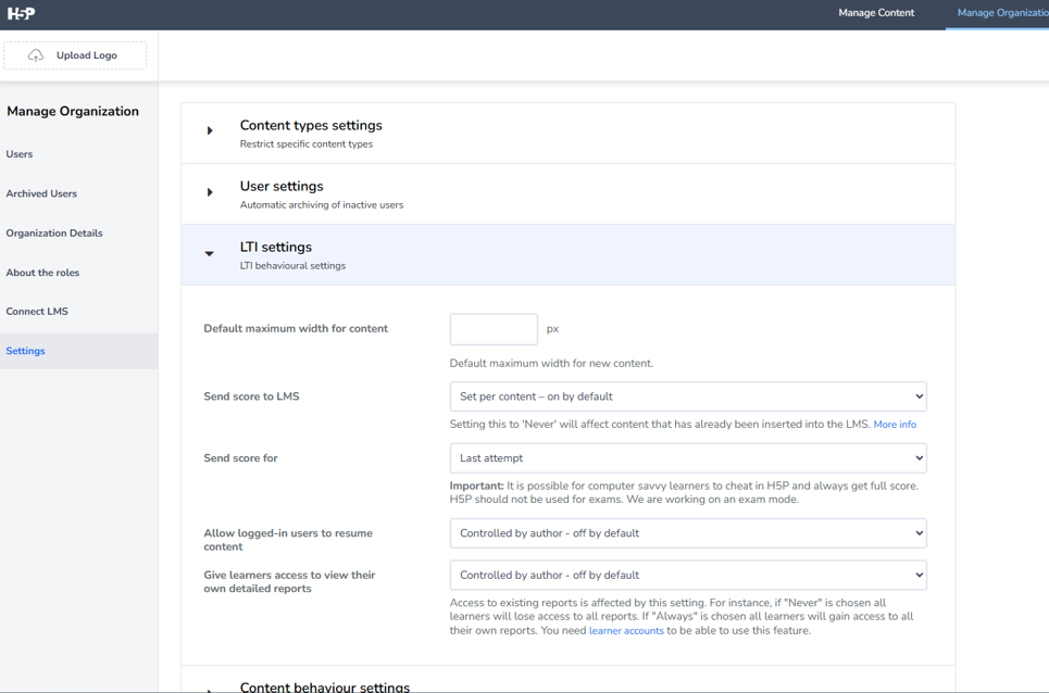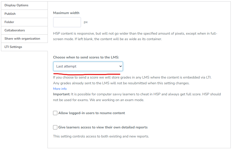 A screenshot of the LTI settings of an H5P interactive, showing an option to 'choose when to send scores to the LMS'