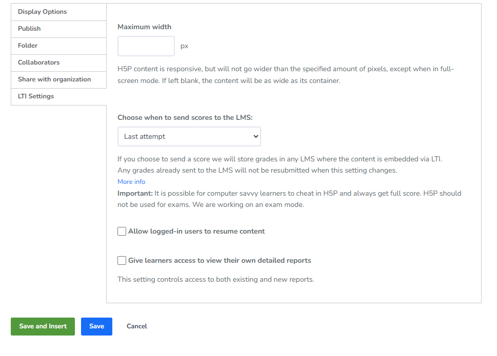 When you edit an interactive in H5P, there will be an option at the bottom called LTI Settings. This is where you can choose whether the score is sent to the gradebook or not.