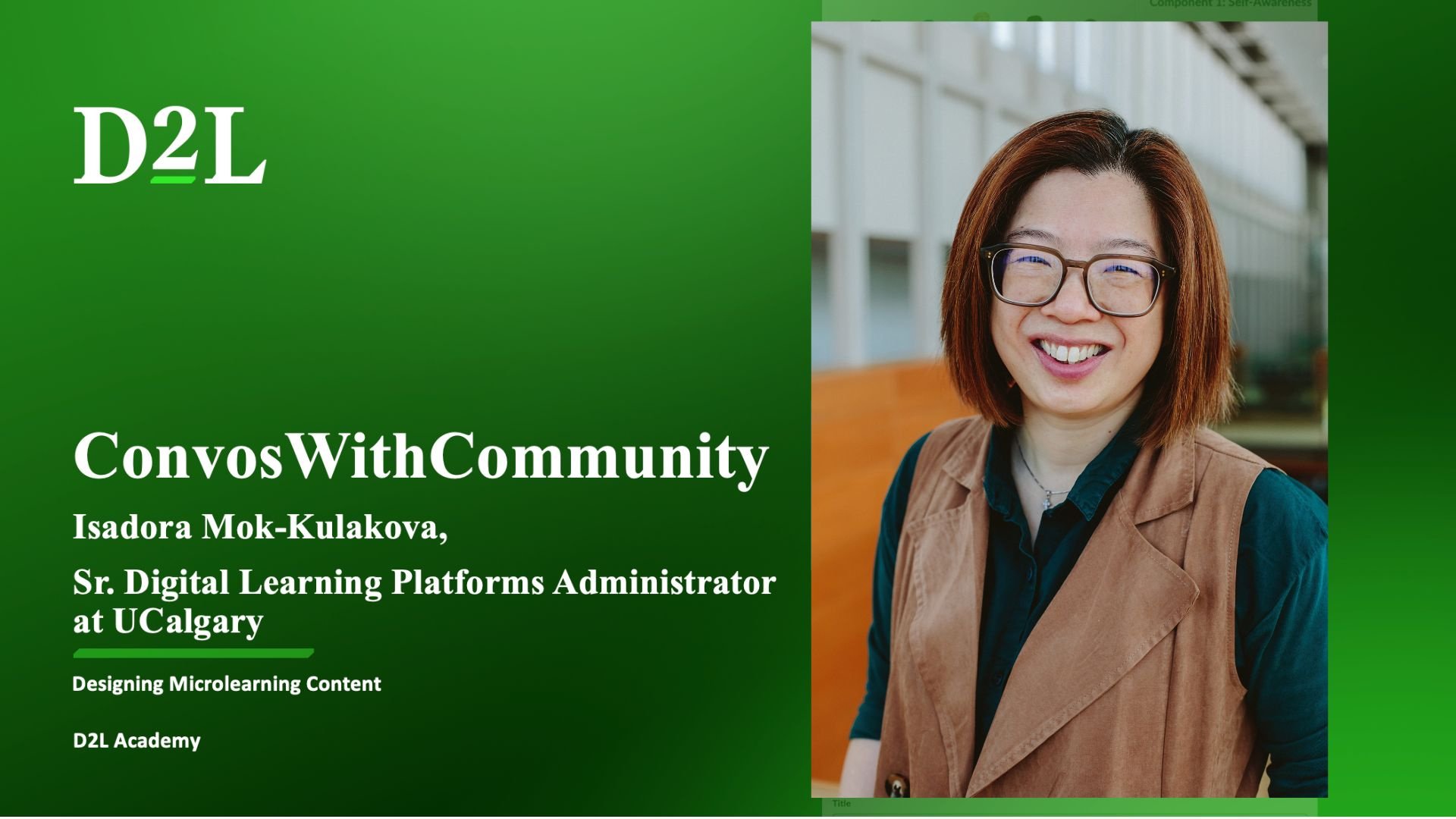 Meet Isadora Mok-Kulakova, Senior Digital Learning Platforms Administrator at the University of Calgary. Isadora brings hands-on experience supporting faculty at scale and is the creator of Designing Microlearning Content for Brightspace Support.