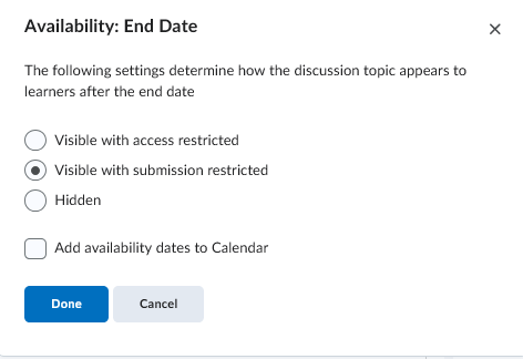 Even though it will display the End Date, students will still be fully able to view all posts, but not reply or add a new comment.
