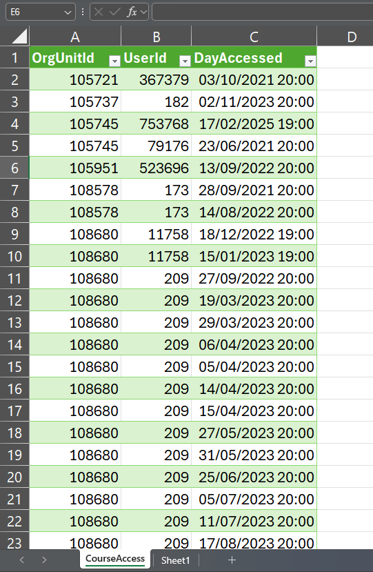 Going a bit more in-depth, when we look at the data data in the CSV files from the Course Access data set, it looks like this example from my test website:This, in a bit of a raw form, already has all the information we need. It shows all the Users (UserId column) who have visited all Course Offerings, and other organizational units, (OrgUnitId) and when that happened. By exclusion, and filtering by OrgUnitId and UserId, we can know which Users were absent. The same is valid for the Course Access Log, but that concerns visits made via the Pulse app.