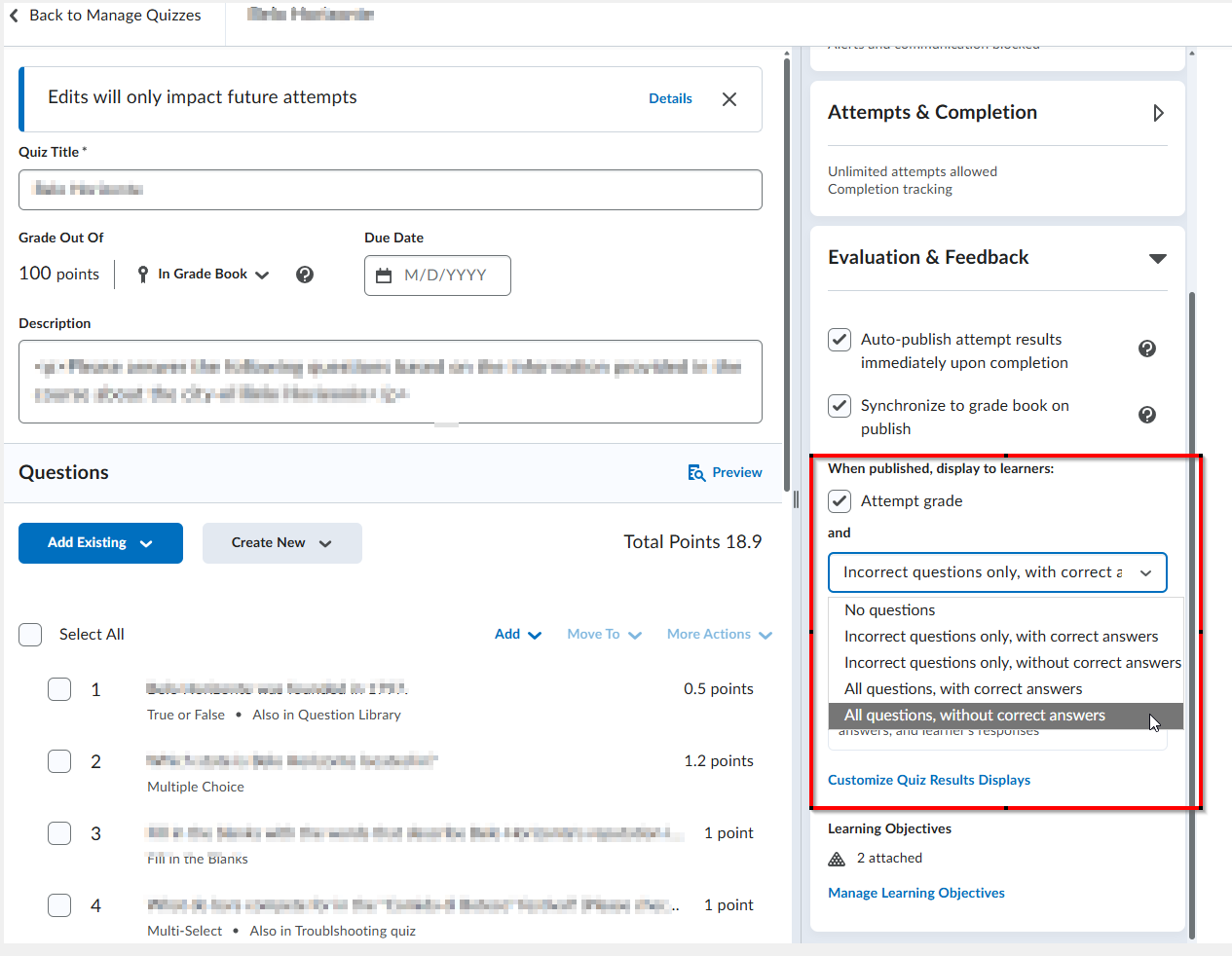 Hello @Mary Anne.V.8344, Please let me know if you I understood you correctly. Are talking about how students can see the quiz questions (with or without correct answers) after they submit their attempt?