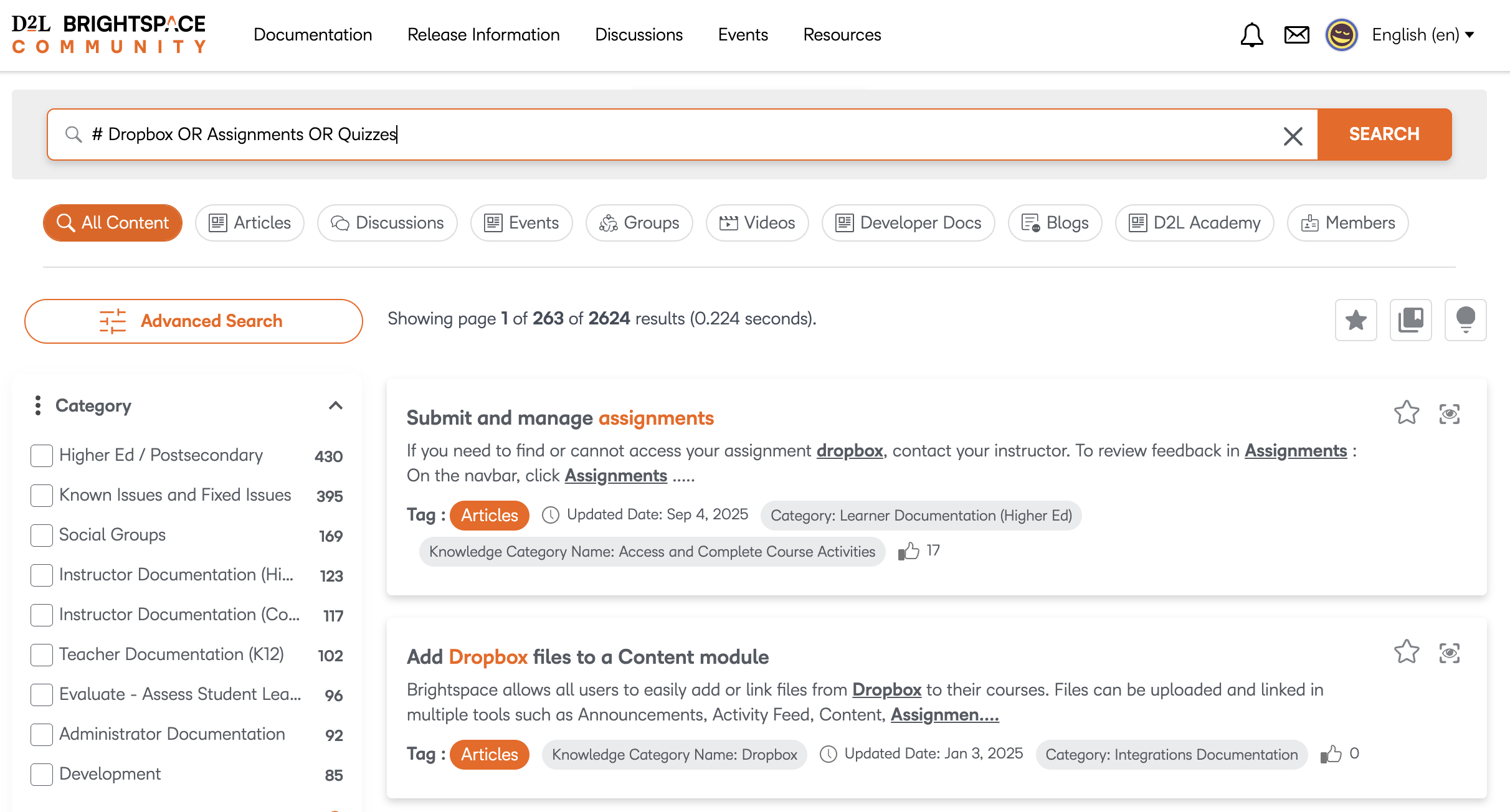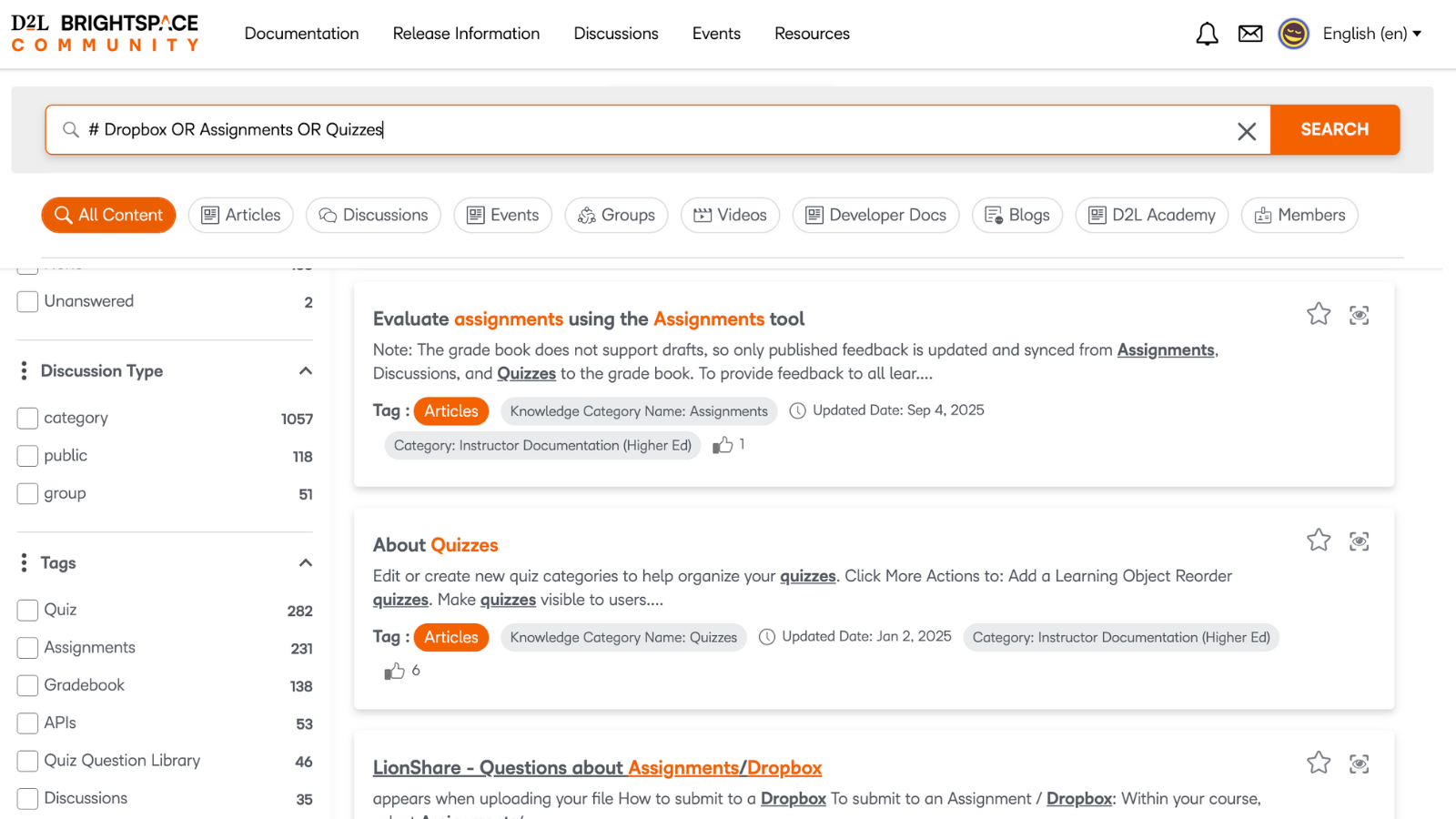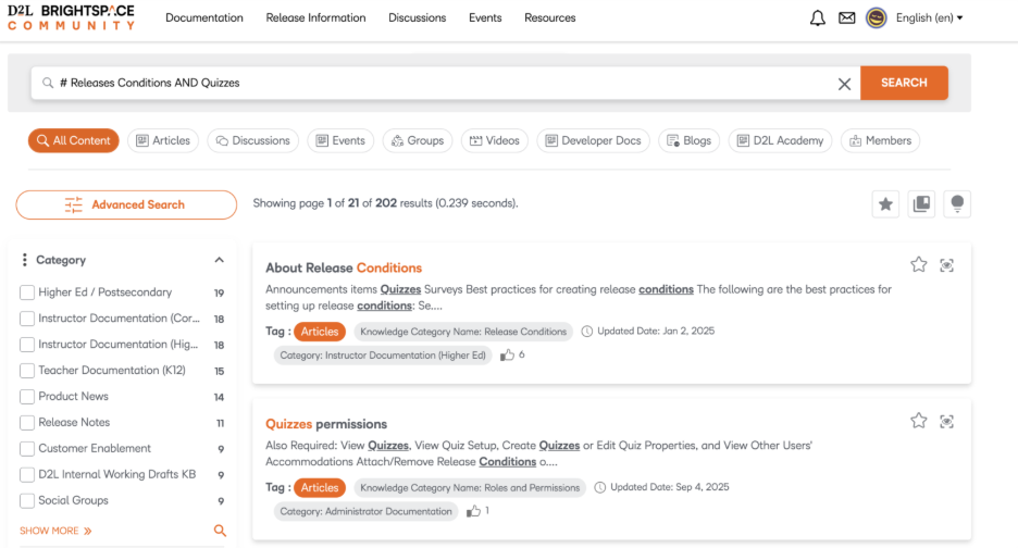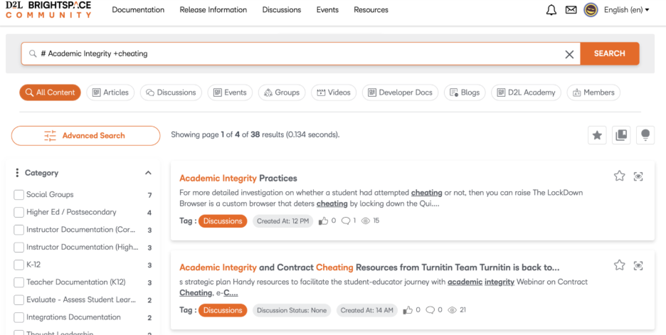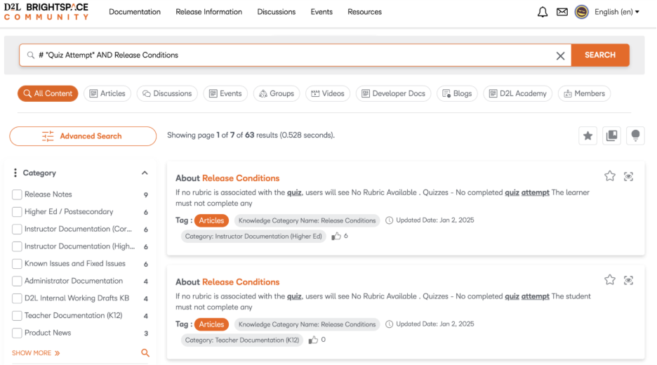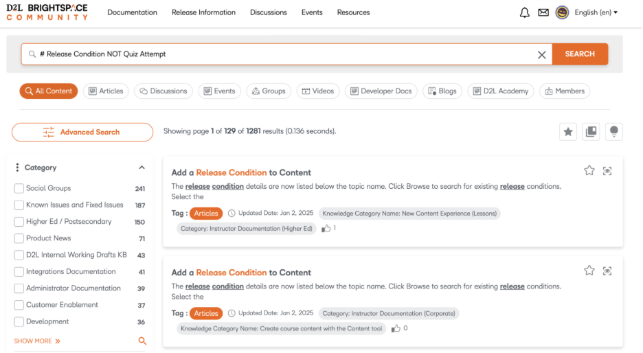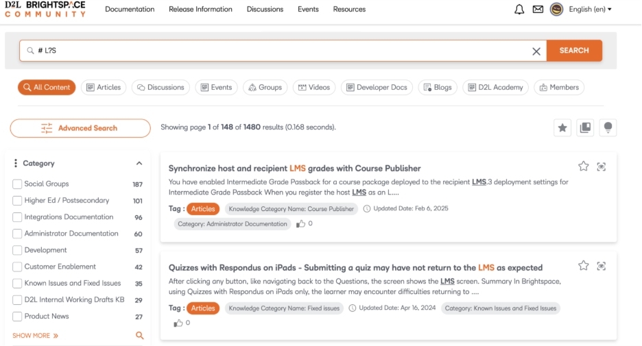 Figure: Use our improved search filters to find external resources such as Brightspace Tutorials videos or Developer documentation.