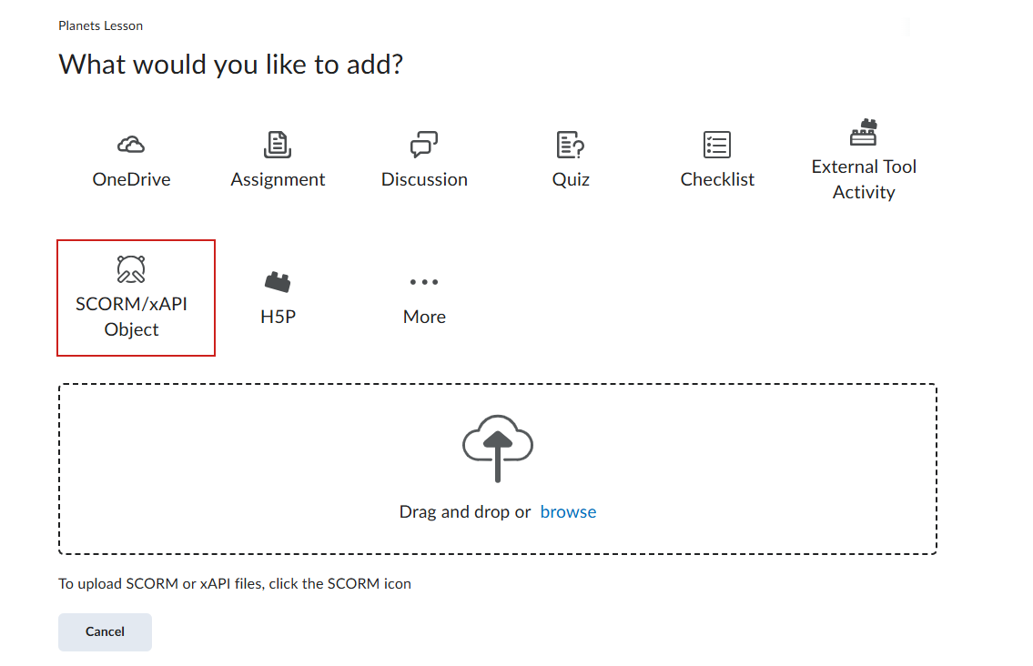 - On the What would you like to add page, select SCORM/xAPI Object.