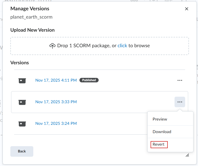 Use this workflow to replace the current SCORM/xAPI package with an older version.