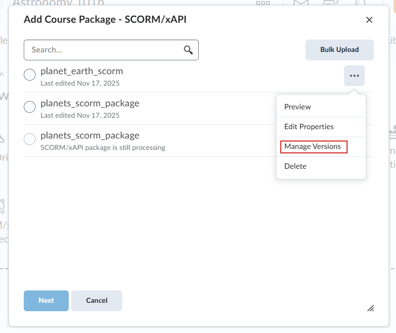 - In the Add Course Package - SCORM/xAPI dialog window, locate the SCORM/xAPI package you want to replace and click the Action Dropdown.