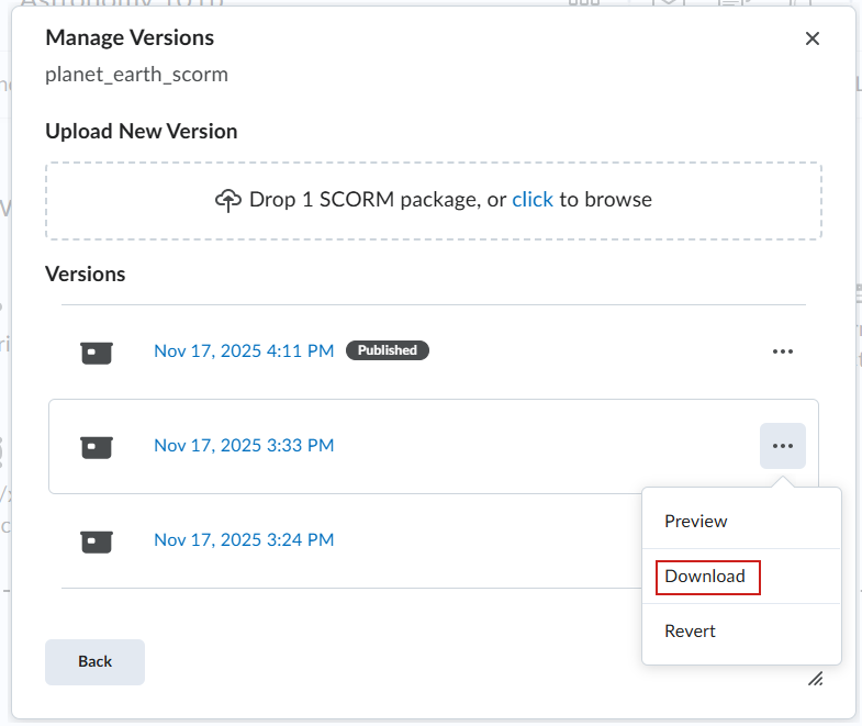 Keeping your SCORM packages up to date ensures learners always access the most accurate version of your content. The version management feature allows you to upload new versions, preview existing ones, download previous iterations, or revert to an older version when needed.