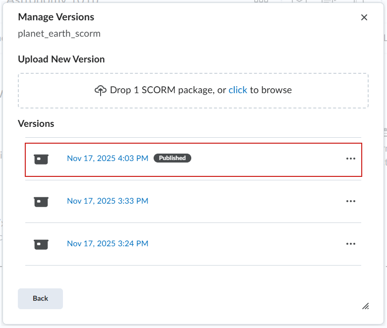 Keeping your SCORM packages up to date ensures learners always access the most accurate version of your content. The version management feature allows you to upload new versions, preview existing ones, download previous iterations, or revert to an older version when needed.