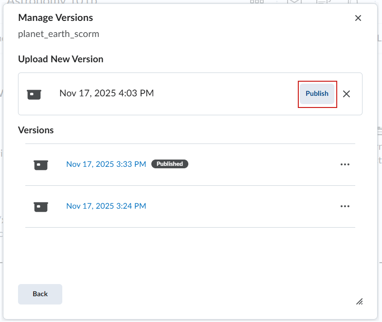 - Click Back to return to the Add Course Package - SCORM/xAPI dialog.