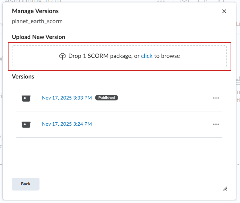 - In the Upload New Version section, drag and drop the updated SCORM/xAPI package or browse to upload it.