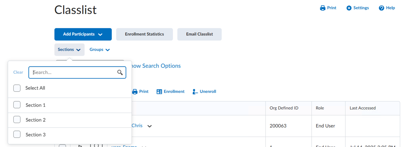The filters options that appear in tools such as Classlist, Grades, and Discussions will be updated to show groups and sections in separate dropdowns. The new controls will let administrators and instructors filter by an entire group category, multiple groups within or across group categories, or multiple sections within a section category. The filter will also introduce a new search bar, allowing for the ability to quickly find a group within a category, or a section, easily.