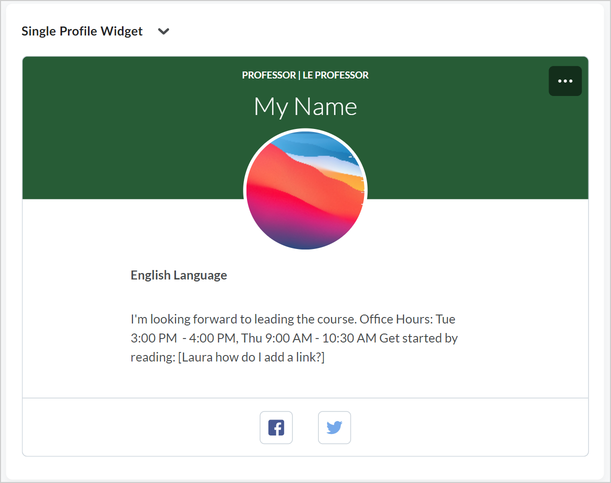 The Single Profile Widget provides in-line authoring that allows instructors, facilitators, tutors, and other users to introduce themselves to learners. Put important details at the forefront, showcase your photo, share social media details, and write other important bio information. Users with the appropriate permissions can upload a photo, add a brief biography, and provide links to social media profiles.